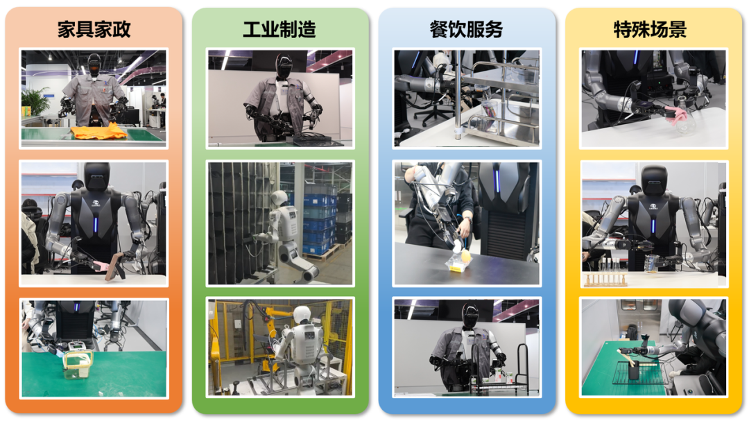 在任务构建方法上,白虎-VTouch并未沿用传统的“人工定义单任务”路径,而是提出“矩阵式”任务构建新范式。该范式以双臂协同结构、原子操作类型、接触与触觉模式作为核心维度,并结合物体与几何属性、感知模态组合及任务层级结构等辅助维度进行系统性交叉,每一个维度交点,均对应一个可执行的最小任务单元。基于这一构建逻辑,白虎-VTouch覆盖了家居家政、工业制造、餐饮服务与特殊作业四大真实应用领域,形成380+任务类型、100+原子技能、500+真实物品的高密度任务空间。同时,通过光照变化、遮挡干扰与姿态扰动等方式显式引入泛化条件,使任务设计从一开始即面向真实部署环境。