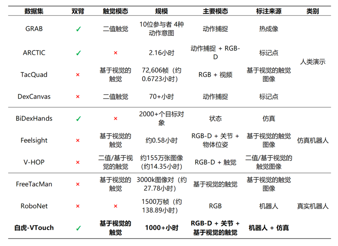 基于真实物理交互与多模态感知数据,团队构建了跨层次交互理解具身标注体系,通过视觉、语言、动作与触觉等多模态语义的联合建模与对齐,实现跨模态表征学习与统一理解,为下一代具身VTLA提供数据标准。白虎-VTouch数据标注体系将分批次开源。