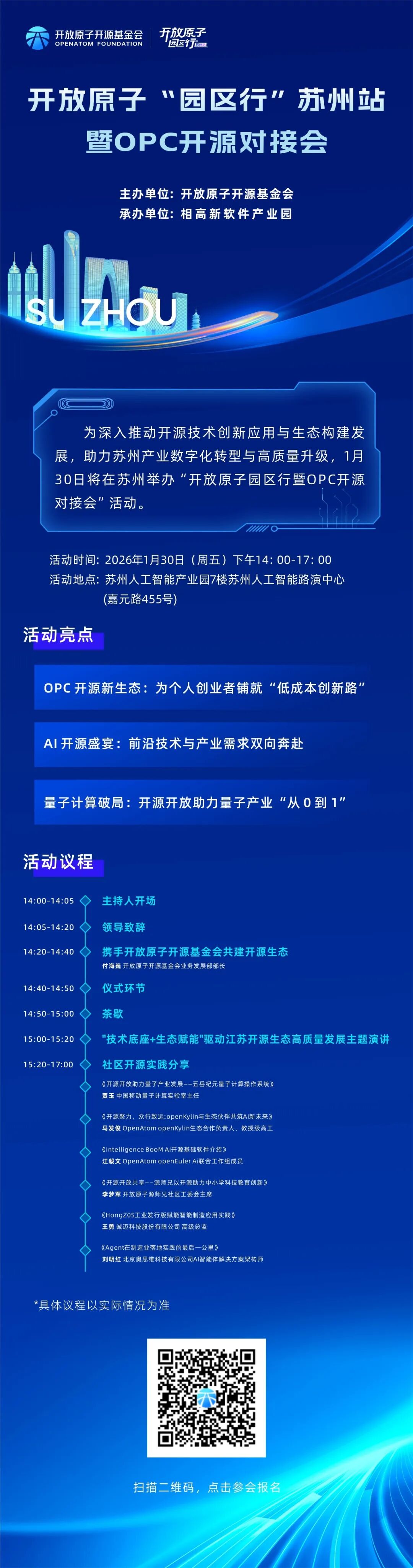 当开源成为产业创新的“加速器”,当苏州的实体经济遇上前沿开源生态,一场聚焦技术突破、创业赋能、供需对接的行业盛会即将启幕。1月30日,开放原子“园区行”(苏州站)暨OPC开源对接会将在苏州人工智能产业园盛大举办,以“技术研讨、需求牵引、成果展示”为核心模式,为苏州数字化转型注入开源新动能。