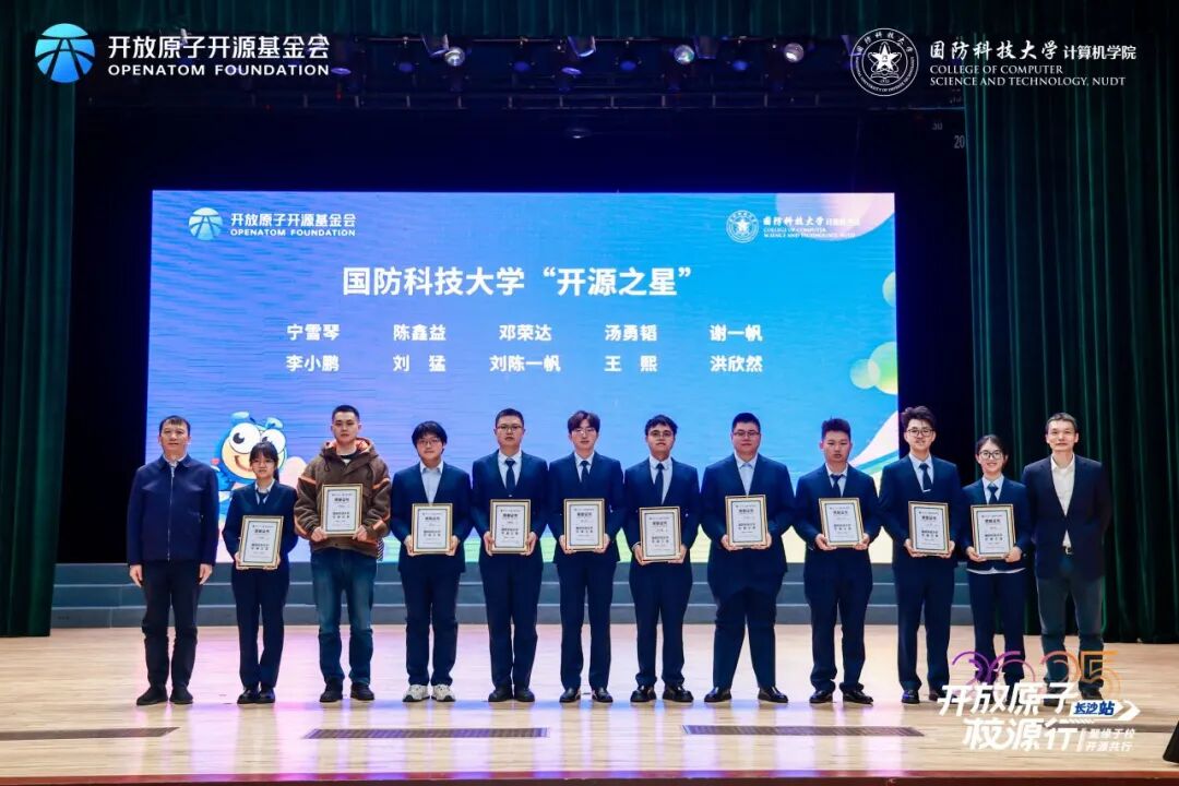 活动期间,国防科技大学联合开放原子开源基金会发起首届“开源之星”奖励计划,吸引校内各学院学生踊跃申报。经校内外专家评审,共有10名学生脱颖而出,荣获“开源之星”称号。
