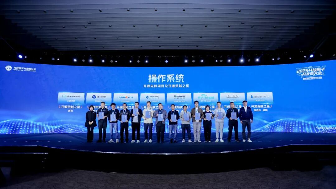 11月21日,在开放原子开发者大会开幕式上,开放原子开源基金会向操作系统、数据库、人工智能三大技术领域开源先锋项目中作出卓越贡献的开发者致谢。